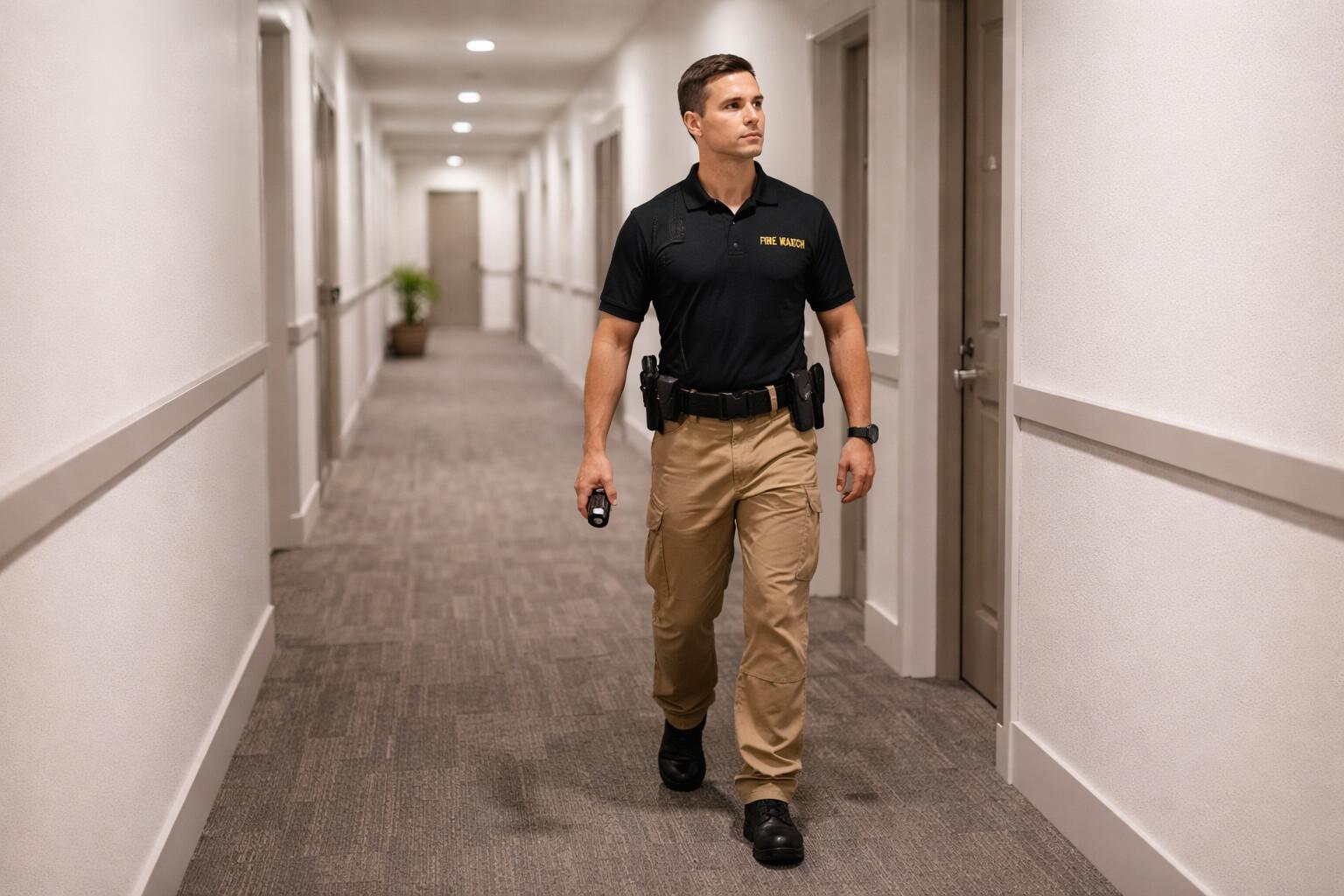 During a fire watch, guards walk all required areas of the property at set intervals. They look for smoke, fire, blocked exits, or unsafe conditions that could put residents at risk. If an emergency happens, they alert the fire department right away and help with evacuation if needed.